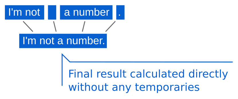 But this comes with a big drawback – unnecessary creation of temporary intermediate results. Namely, in the previous example, we have one temporary string to hold the result of the statement + spacepart of the expression, then that string gets concatenated with number which yields another temporary string. The second temporary string then gets concatenated with period which gives us the final result after which temporaries are then destroyed.