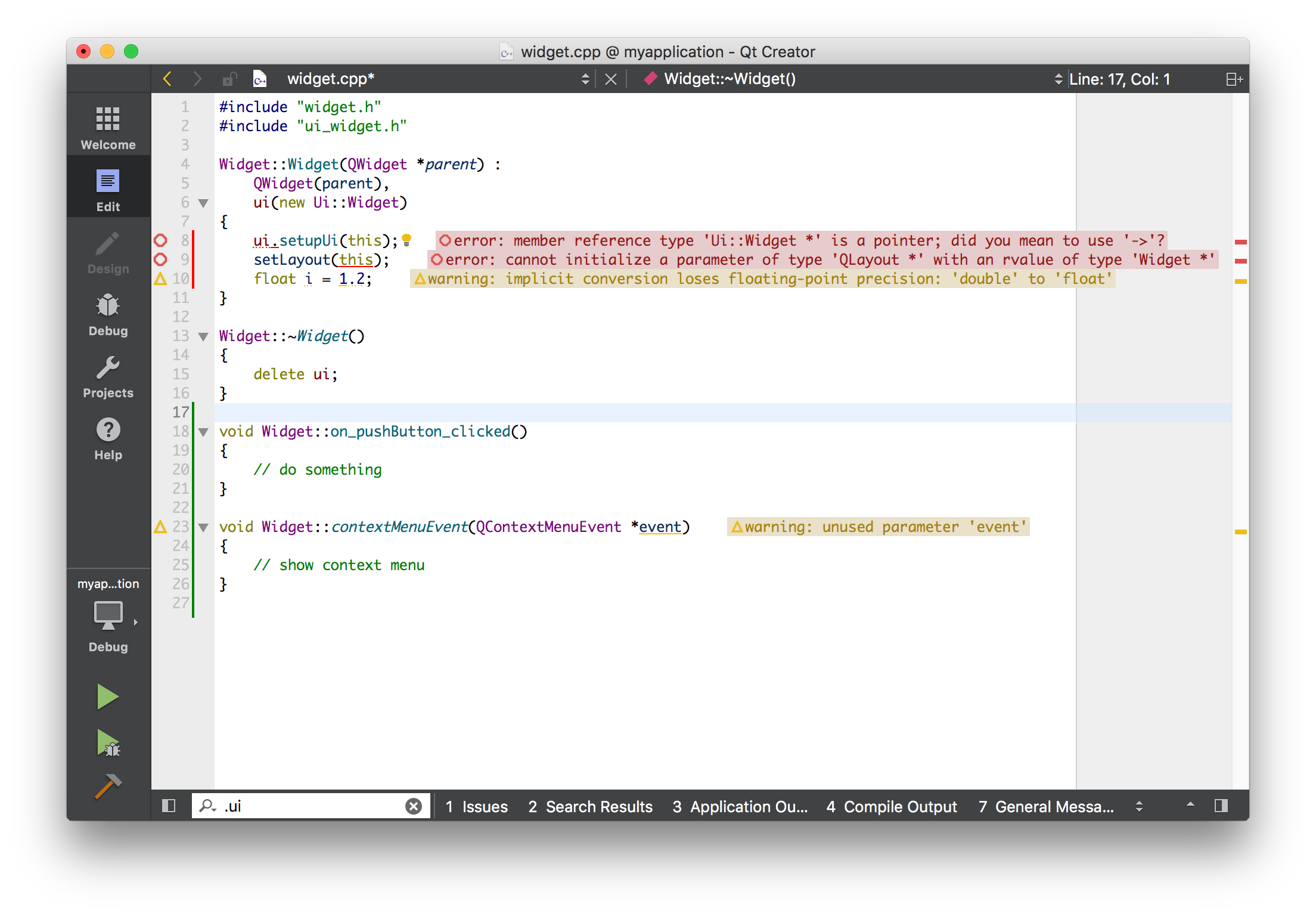 This version of Qt Creator features optional inline annotations for warnings and errors from the Clang code model and for bookmark comments (Options > Text Editor > Display > Display annotation behind lines). This way, you can easily see the details of issues while you type, without the need to hover your mouse over underlined text or the marker on the left side.