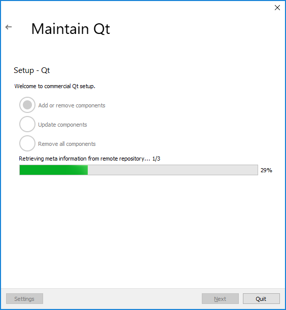We have now released Qt Online installer and Maintenancetool version 3.0.5. Especially, the metadata download has been improved. Metadata is downloaded now in smaller chunks as in some devices the metadata download got completely stuck due to huge simultaneous download tasks. You see this in UI as external step counter above scrollbar.