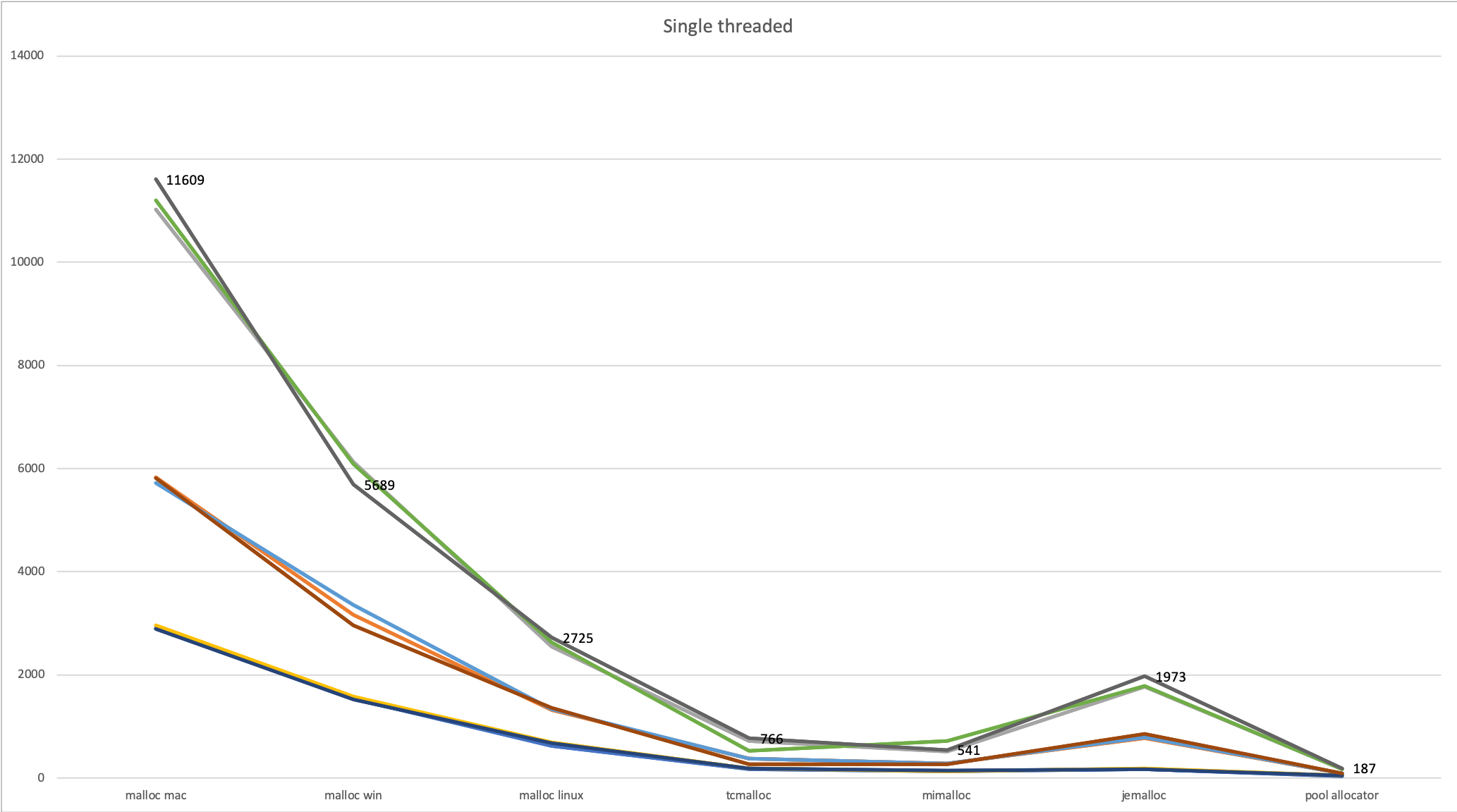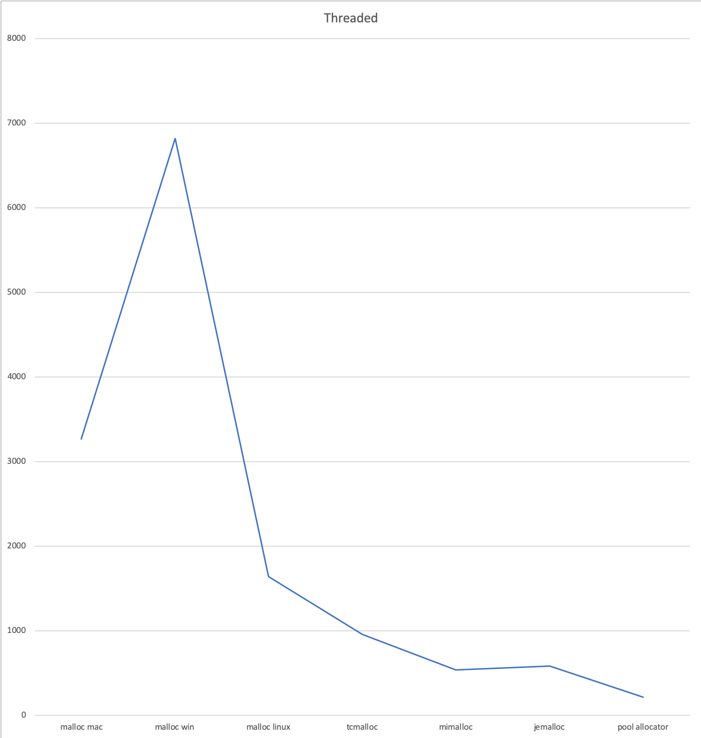 The threading model used here is the full multi-threaded implementation, with which our allocator still beats the fastest general purpose alternative by a factor of 2.5, and the default system mallocs consistently with a factor of at least 7.
