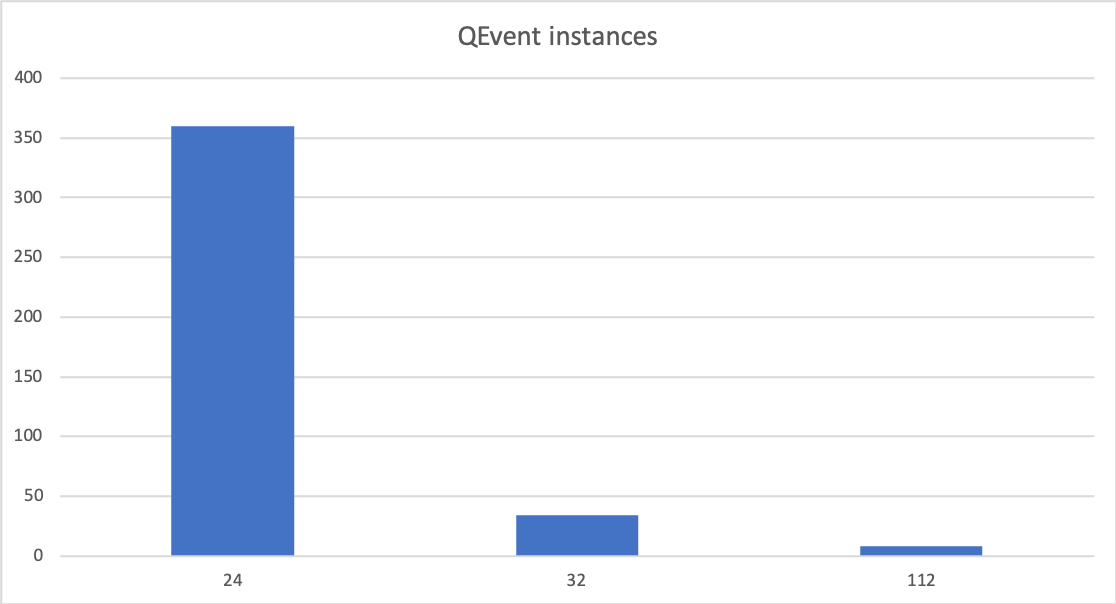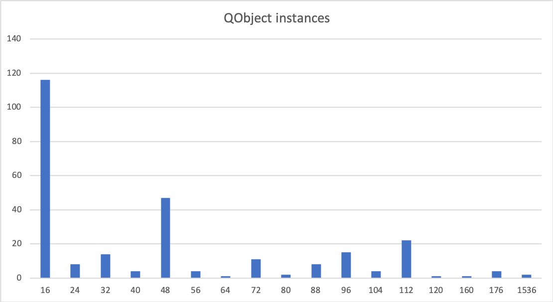 Doing the same for QObject gives us a wider spread, but also here, the majority of instances is small, with 16 bytes being by far the most common size.
