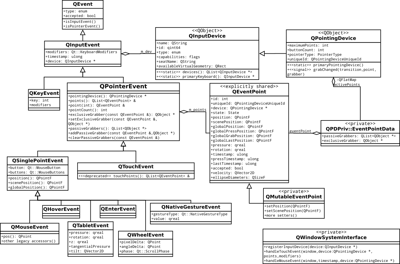 The delivery of mouse and touch events in Qt Quick is complex, and it became clear a few years ago that we needed to refactor the event inheritance hierarchy, to have some common API for various event types, so that more of the delivery code could be shared. In Qt 5.8 we added QQuickPointerEvent and associated types, as a way of prototyping what that could look like. They are QObjects; and since then, QQuickWindow has been delivering these wrapper events that carry the original events inside. Now finally in Qt 6 we have been able to complete the QEvent refactoring, so that QQuickWindow no longer needs the wrappers. Along with that, we were able to add a few features and fix a few bugs. Many of the remaining bugs that seemed intractable in Qt 5 should at least be possible to fix later on.
