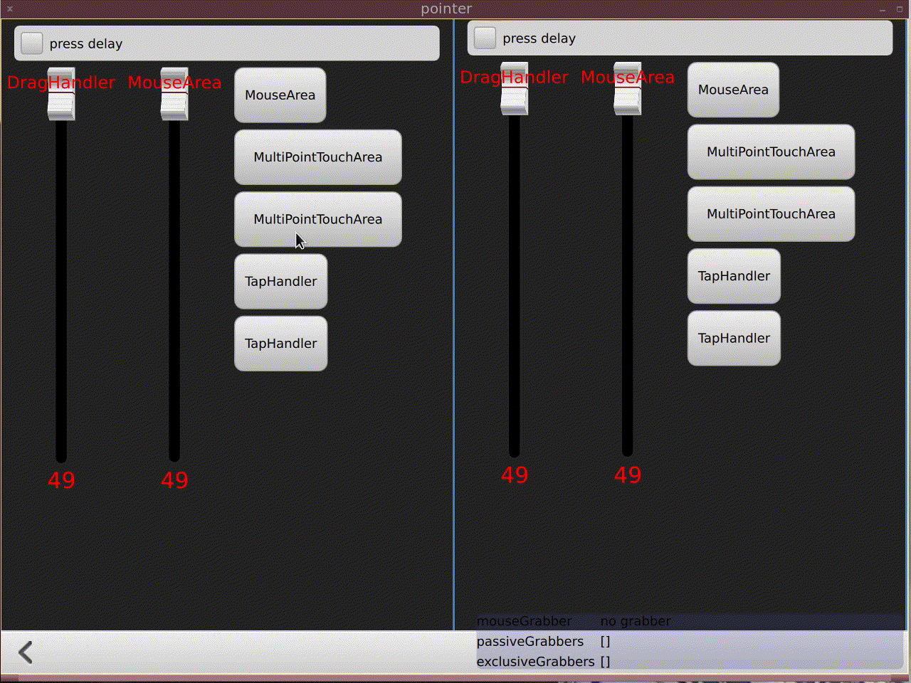 Multi-touch still doesn't work with the remaining mouse-only items like MouseArea though, because those still rely on synth-mouse events. But it can be avoided. In general: try to use Event Handlers rather than MouseArea, because (as its name indicates) it's not really intended to support anything more than mouse interaction.