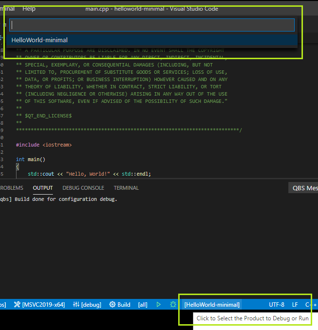 The product to build can be selected in a similar way, via a button or via the "QBS: Select Build Product" command. The Special "all" value can be used to build all products: