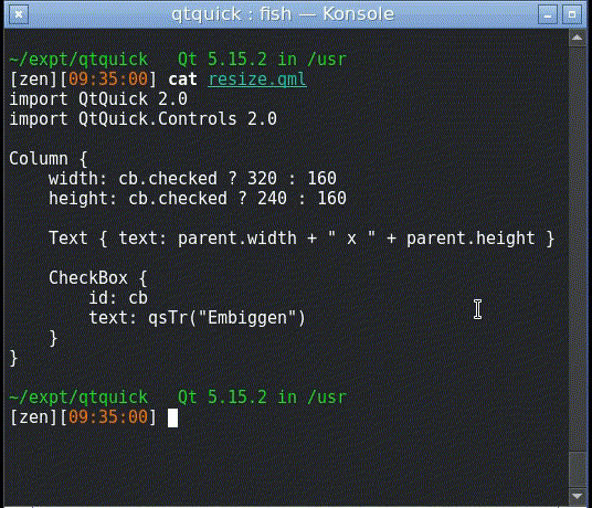 The default configuration makes the wrapper window behave much like qmlscene does by default: when you resize the window, the Item that you declared will be resized to fit the window. The resizeToItem configuration is equivalent to the qmlscene --resize-to-root option and the QQuickView::SizeViewToRootObject enum: when you programmatically change the size of your root Item, the wrapper window will be resized to fit (to the extent that your windowing system allows it). This mechanism was the one we used before Window was introduced, as a way for an Item-based application to control its own default size.
