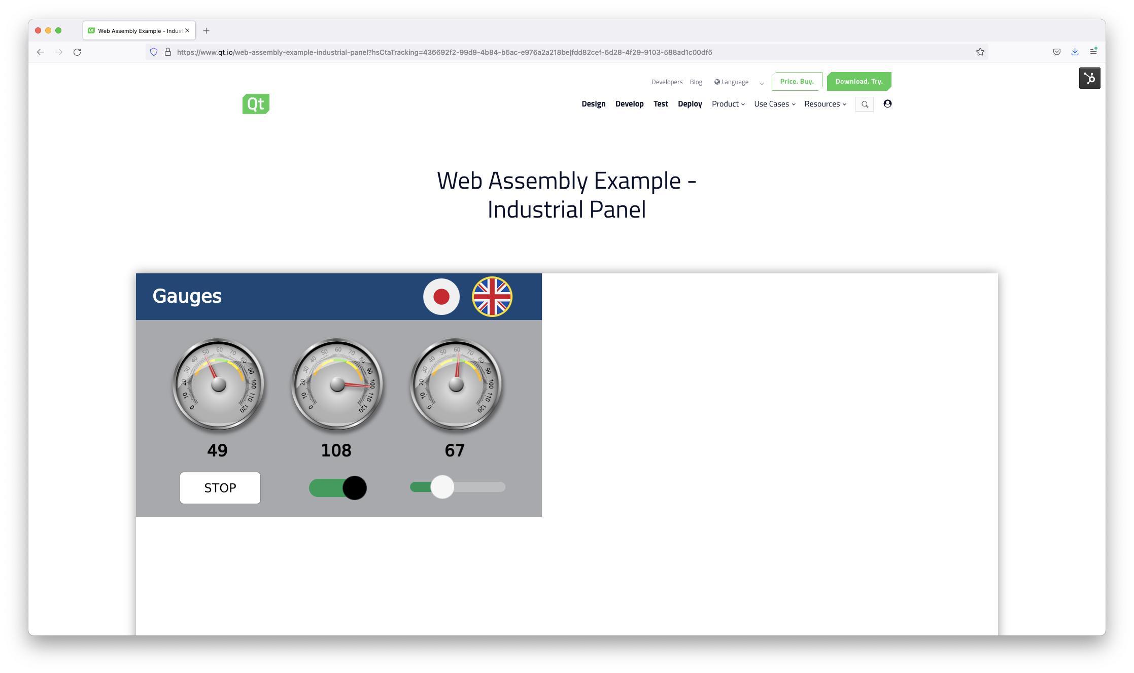 Industrial panel - Originally made to show various use cases of Qt running on low-powered embedded hardware. This demonstrates how the same UIs could also be accessed through a web browser with no need for any changes to the code.