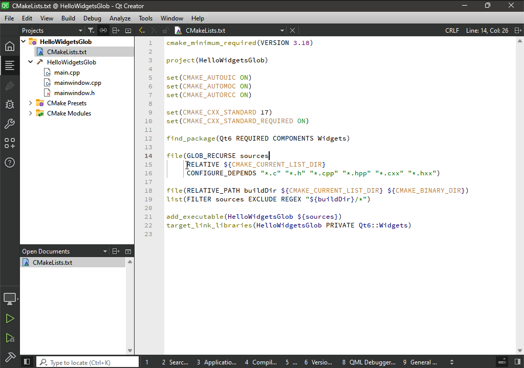 Qt Creator 14 will no longer modify the CMakeLists.txt project file for CMake projects that use file(GLOB|_RECOURSE) to quickly create an executable or library by using *.cpp *.h globbing patterns.