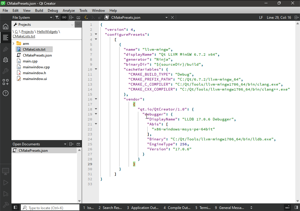 { "version": 4, "configurePresets": [ { "name": "llvm-mingw", "displayName": "Qt LLVM MinGW 6.7.2 x64", "generator": "Ninja", "binaryDir": "${sourceDir}/build", "cacheVariables": { "CMAKE_BUILD_TYPE": "Debug", "CMAKE_PREFIX_PATH": "C:/Qt/6.7.2/llvm-mingw_64", "CMAKE_C_COMPILER": "C:/Qt/Tools/llvm-mingw1706_64/bin/clang.exe", "CMAKE_CXX_COMPILER": "C:/Qt/Tools/llvm-mingw1706_64/bin/clang++.exe" }, "vendor": { "qt.io/QtCreator/1.0": { "debugger": { "DisplayName": "LLDB 17.0.6 Debugger", "Abis": [ "x86-windows-msys-pe-64bit" ], "Binary": "C:/Qt/Tools/llvm-mingw1706_64/bin/lldb.exe", "EngineType": 256, "Version": "17.0.6" } } } } ] }