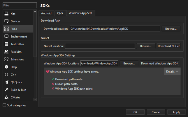 We have created a new settings category Preferences > SDKs to accomodate the Android, QNX, and MCU SDK preferences together with a new setting for the Windows App SDK there.