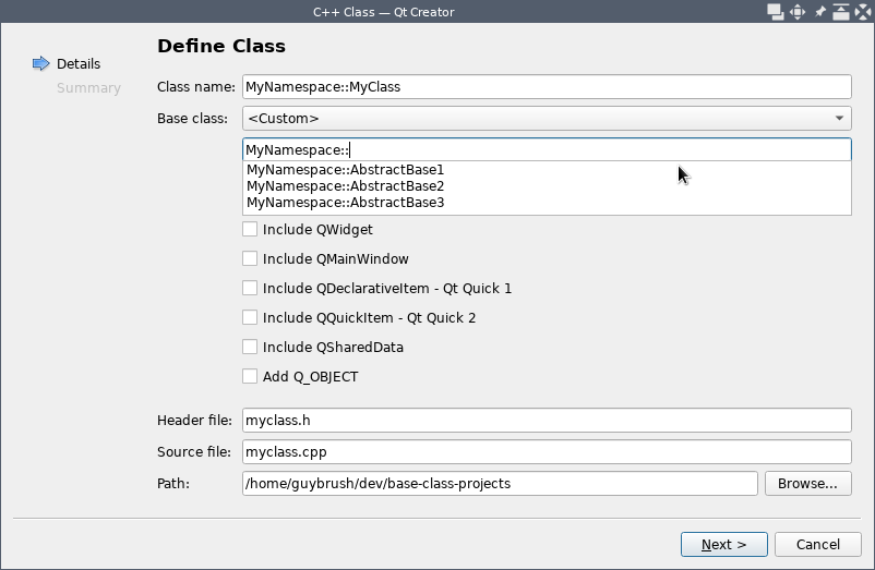 - The "New C++ Class" wizard now has knowledge about the code model and can provide completion for namespaces and class names (when choosing a base class).