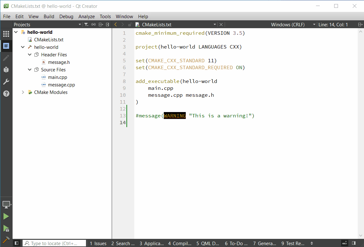 CMake Warnings are displayed in the Issues pane