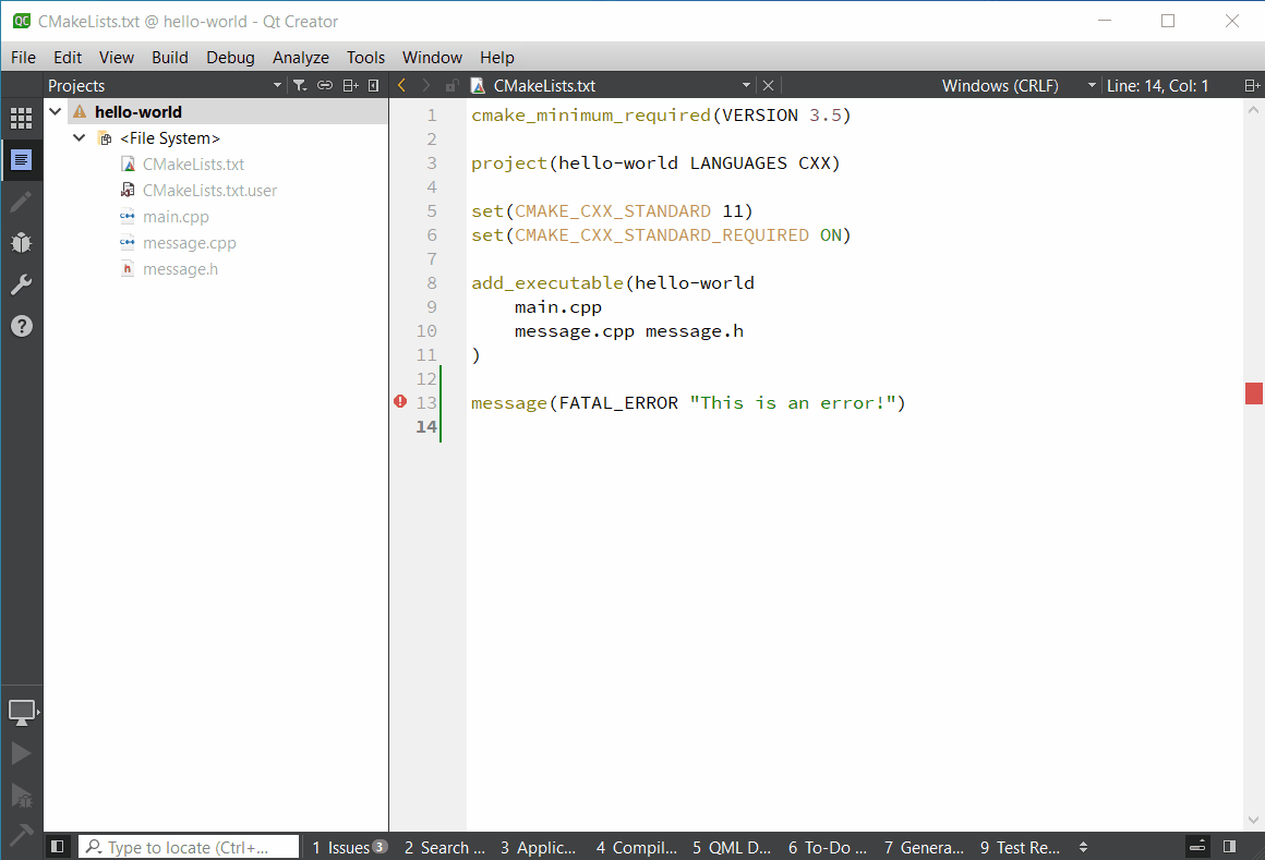 If the project fails to load or the previous working configuration has been restored, Qt Creator 6 will display a warning icon in the project tree.