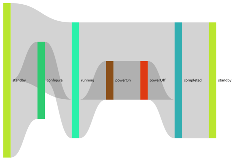 One powerful way to explore device usage is by visualizing state transitions in a Sankey diagram. In the example below, one can see how an infusion pump moves through different states—standby → configure → running → completed → standby.
