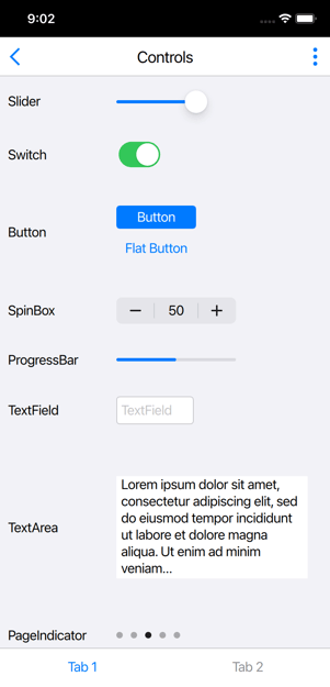 Most of the controls have a similar look and feel to the UIKit controls. However, there are slight differences. Below is a general description of some of the controls as compared to the iOS native ones.