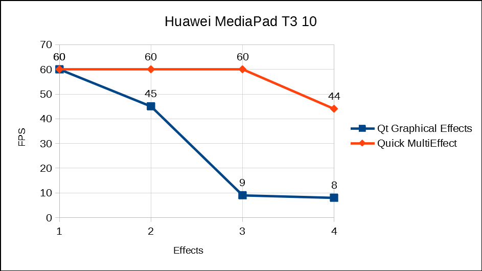 - EffectsBench, which compares performance of QuickMultiEffect vs. Qt Graphical Effects when the amount of effects and items increases.