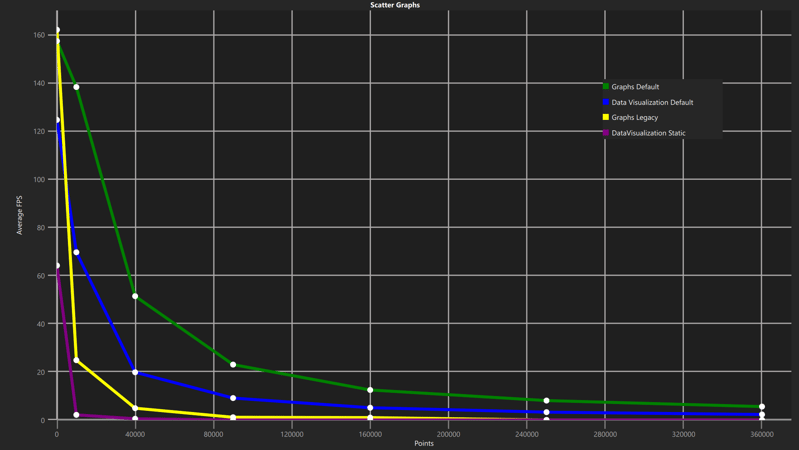 While the Legacy configuration of 3D Graphs performs weaker than default Data Visualization, the average FPS for each graph is notably higher for the default configuration of 3D Graphs, suggesting that the new techniques are effective in increasing performance.