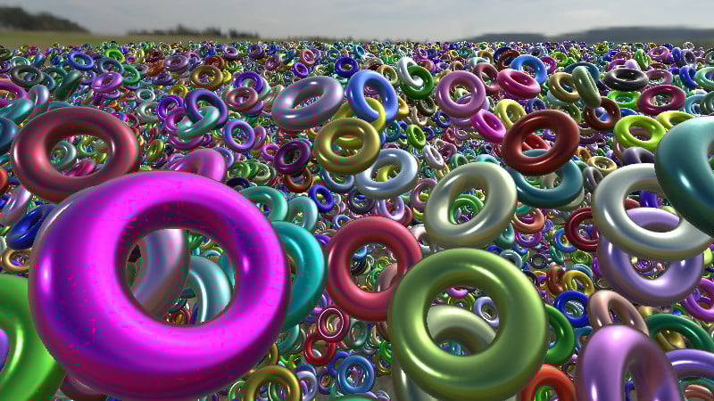Here is the source code for the simple example shown above, creating a scene that shows 20 000 metallic doughnut shapes with random position, color, and rotation: