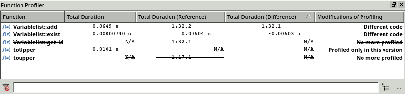 The Function Profiler window further confirms this finding. Coco highlights the modified functions in bold, underlines the new functions and strikes-out the removed functions. Now, by measuring the difference of the execution time (1 minute and 32 seconds), we can see that the performance gain is nearly the same as the previous execution time.