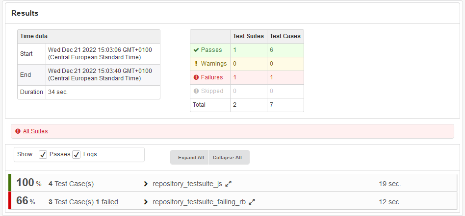 - Runs Squish tests (both failing and successful) and generates a JUnit report and HTML report and sets --exitCodeOnFail 13 setting.