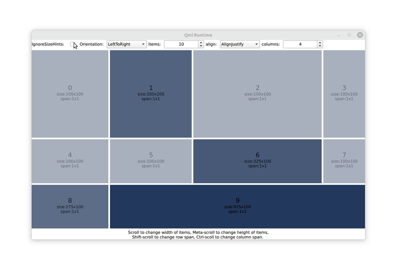 We think this addition increases the flexibility of responsive layouts substantially. It allows to change the number of columns and rows quickly without worrying or even thinking about filling up all lines. A nice side effect is, that we can make smart decisions at runtime when expanding items to fulfill the align-justify rule and increase the size of the item with the largest preferred size. Unfortunately, this addition has to live deep in the existing layout class and will require a patch and recompiling of Qt.