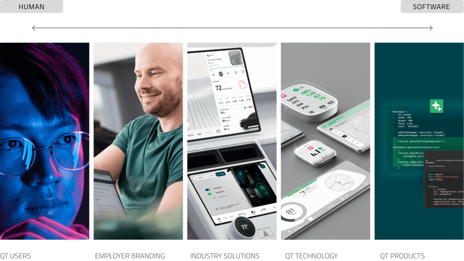 With themes, we can use our images across our different brands. Our themes range from top-of-the-funnel images displaying Qt's meaningful role in humans' lives to bottom-of-the-funnel images displaying software creation at its very core.