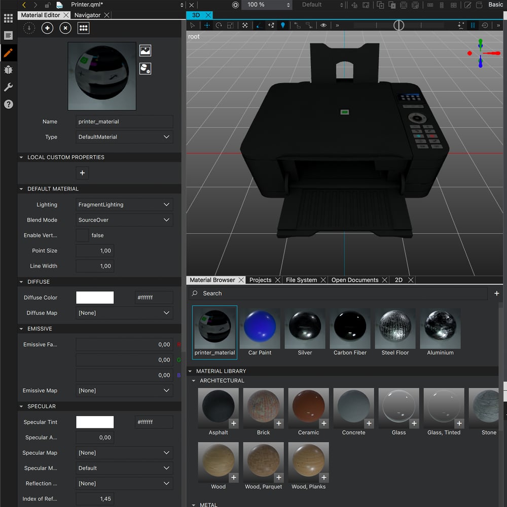 Materials and lights bring the 3D objects and scenes to life. Qt Design Studio offers full support to physically based rendering (PBR) for seamless compatibility with standard material models. Adherence to the PBR standard substantially simplifies the task of importing 3D assets in that it ensures that the model will look in Qt Design Studio exactly the same as in the content creation tool, without the need to create custom shaders for different surface types.