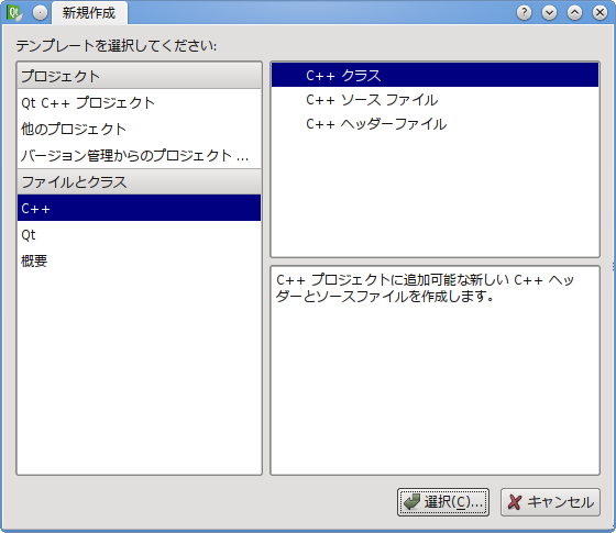 「ファイルとクラス」の中から「C++」を選択し、右上のリストの「C++ クラス」を選択し、「選択(C)...」ボタンをクリックします。
