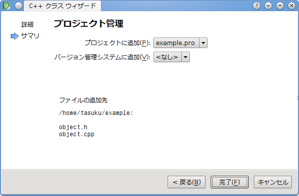 object.h と object.cpp が作成され、プロジェクト example.pro に追加されます。