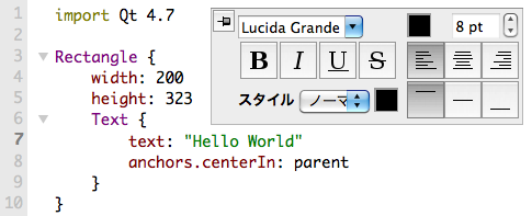 大幅な変更はありませんが、多くの細かな改善を行っています。QML テキストエディタのもっとも目につきやすい新機能は「Quick ツールバー」です。このツールバーを用いることで QML 要素の様々なプロパティを GUI で変更することができます。たとえば Text 要素のフォントプロパティの変更は通常のテキストエディタと同様に簡単に行えます。