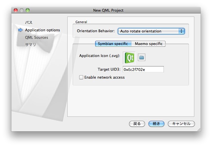 qmlviewer を使わずに QML アプリケーションを携帯電話で動かすにはどのようにすればよいのでしょうか。最も簡単な方法はそのための C++ アプリケーションを作成する方法です。私たちは新しい「QML アプリケーション」ウィザードでそれをサポートします。この新しいプロジェクトでは、qmlviewer で QML ファイルを実行するプロジェクトで使用していた '.qmlproject' 形式のファイルを置き換えます。