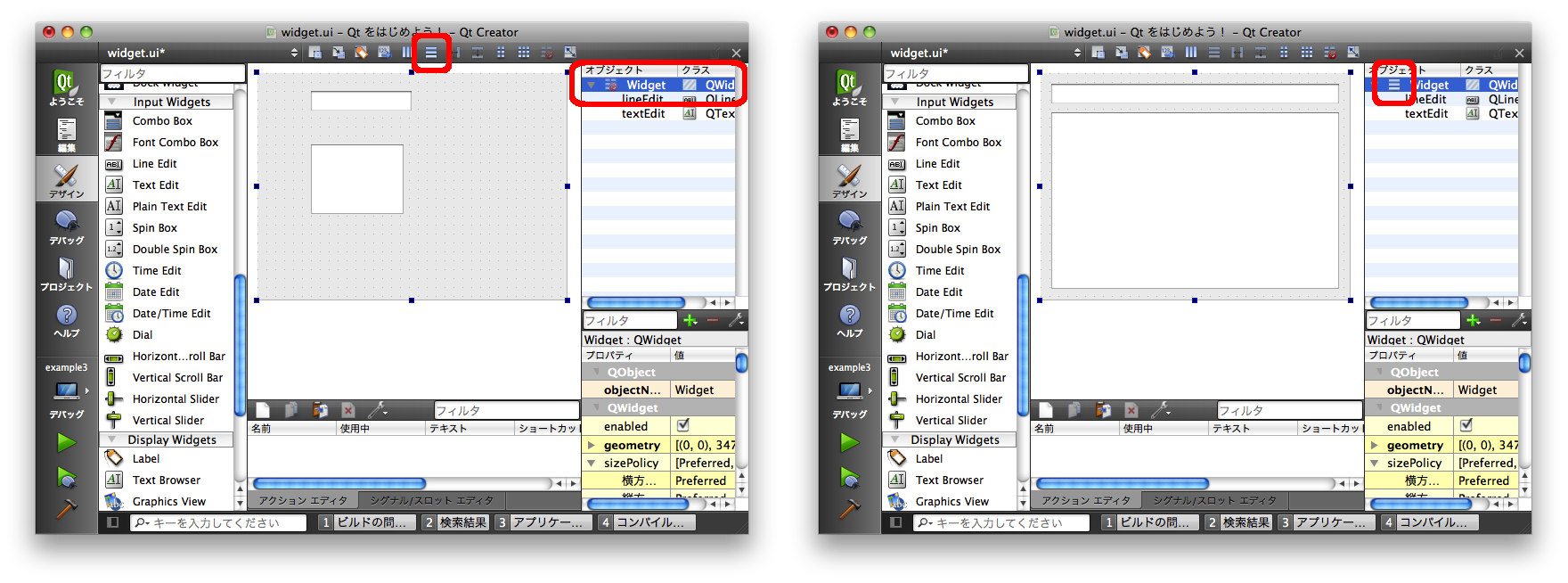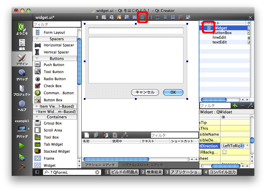 この2つの子ウィジェットを親ウィジェット(ここではフォーム「Widget」)にレイアウトする場合には、以下のようにそのウィジェット自身を選択した状態でレイアウトを設定します。