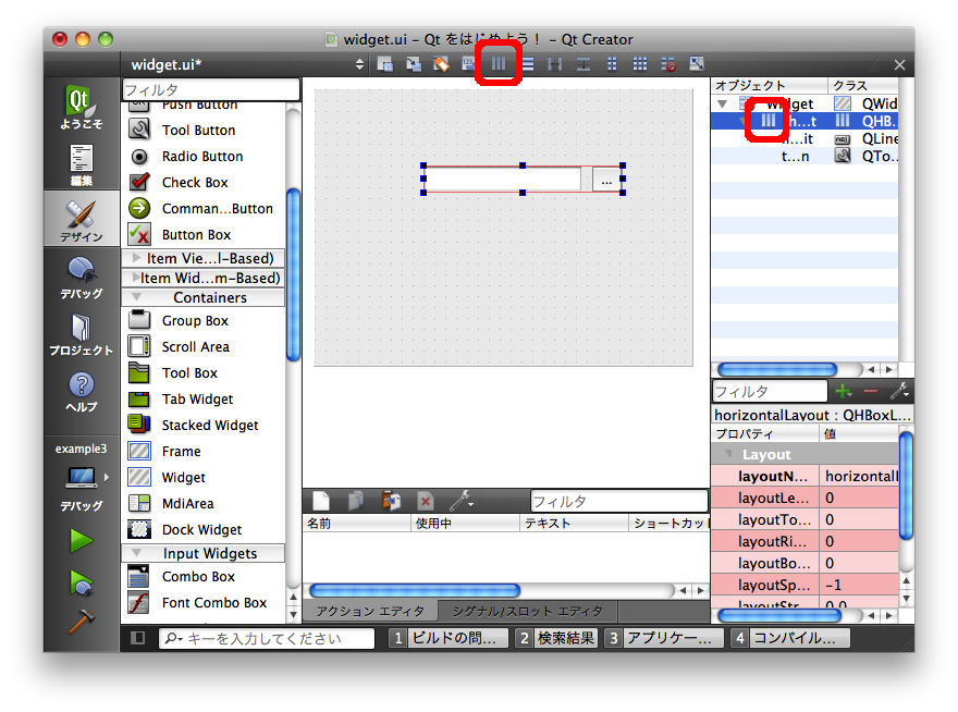 逆に、単にこの2つのウィジェットを並べるためにレイアウトを使用したい場合には、対象となるウィジェットを選択した状態でレイアウトを設定します。