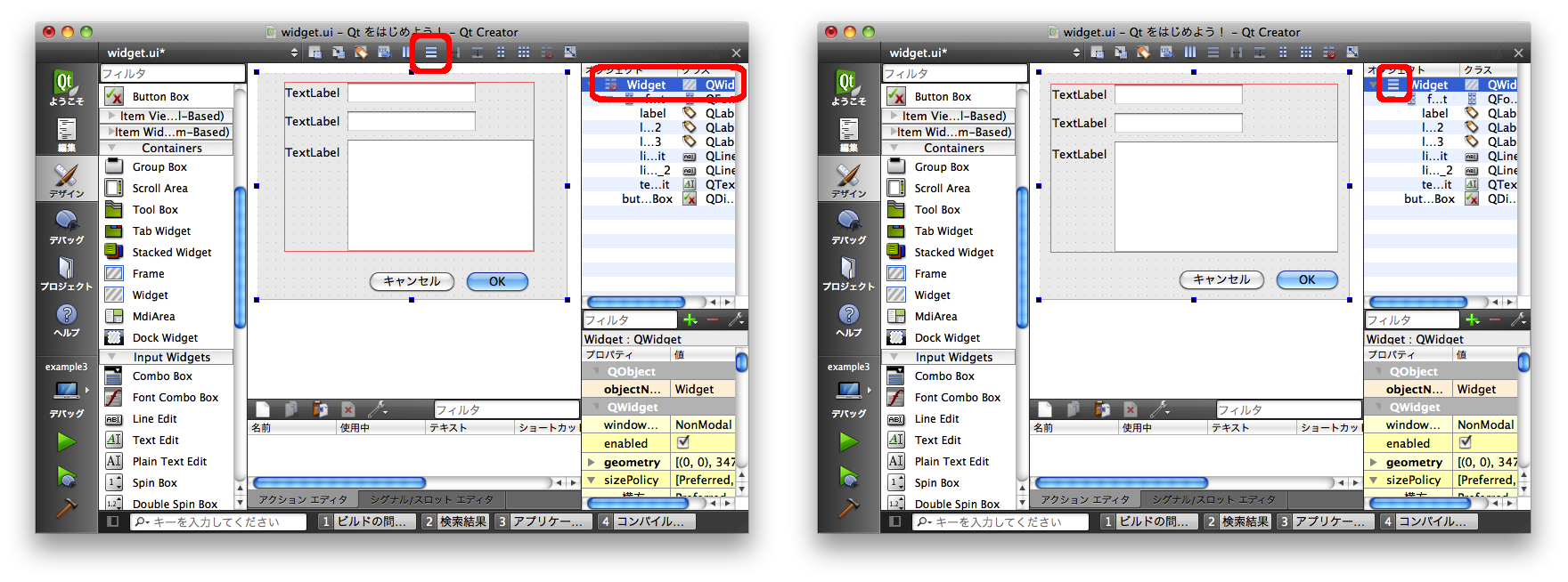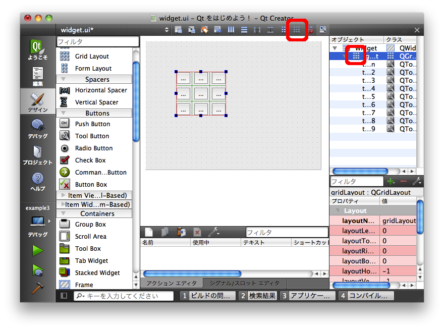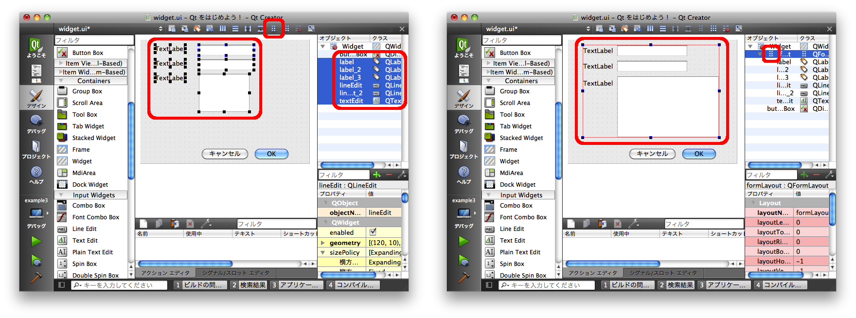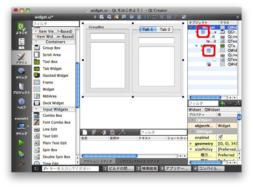 上記の例では QWidget に対してレイアウトを設定しましたが、「Containers」グループにあるような子ウィジェットを含む目的で使用されるその他のウィジェットの場合も、それらのウィジェットに対してレイアウトを設定することが可能です。