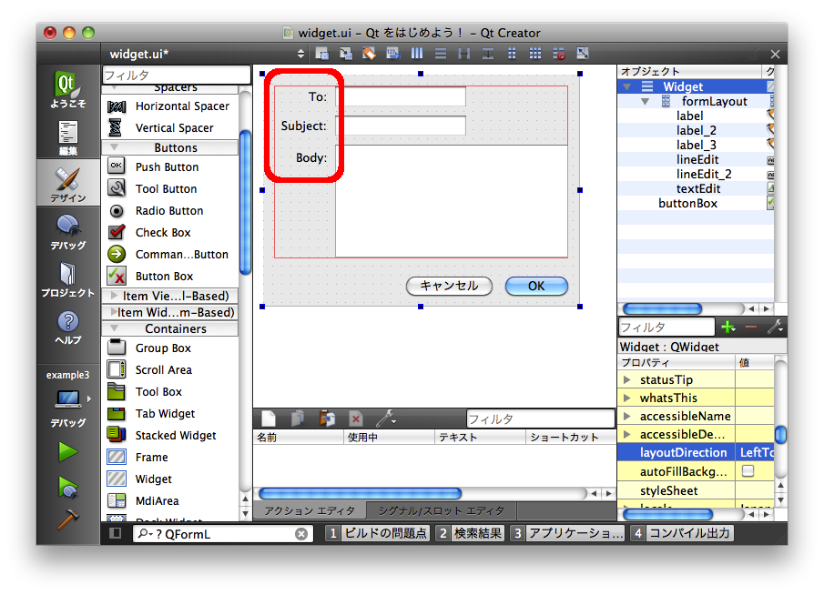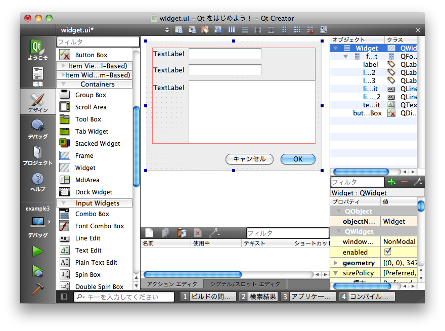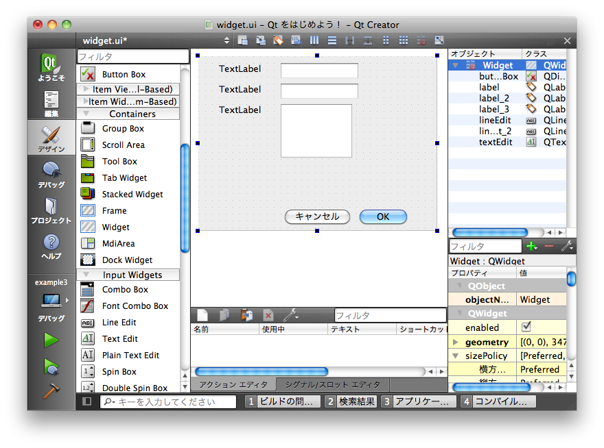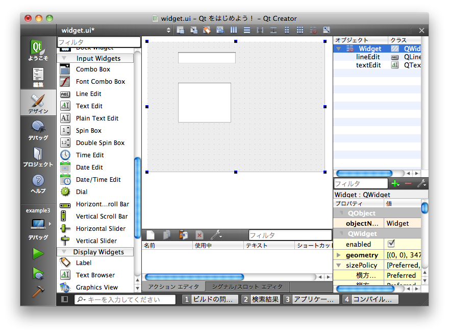 以下のように「Line Edit」と「Text Edit」をフォーム上に配置してください。