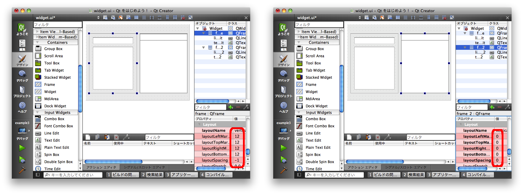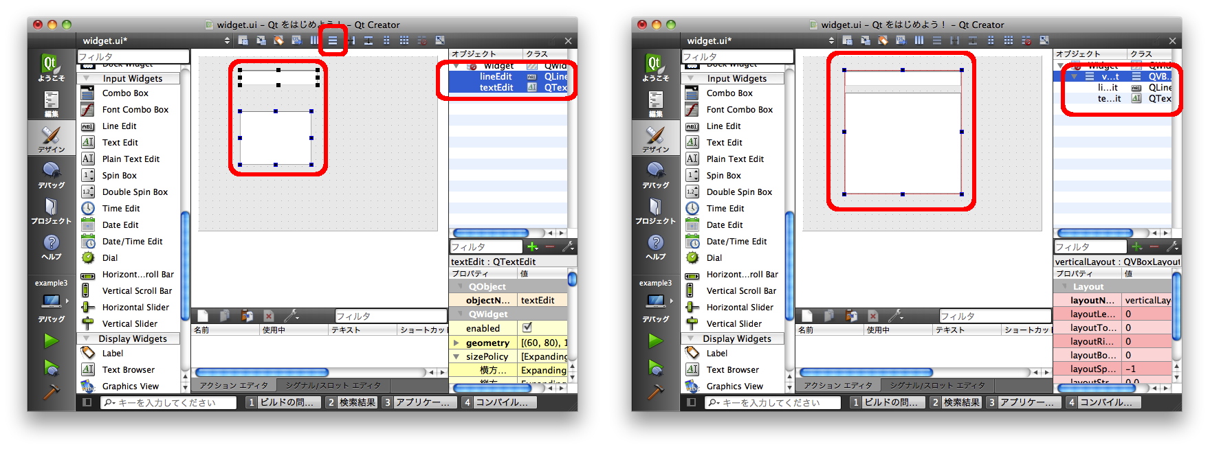 以下の図は Frame に Line Edit と Text Edit を垂直方向にレイアウトしたものを左右に置いています。