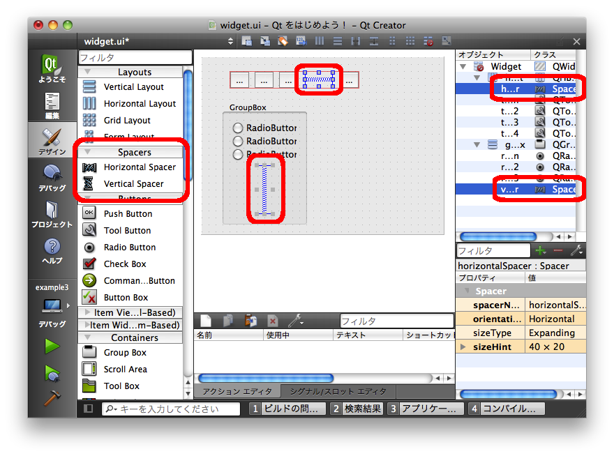 レイアウトの中で空間をあけたい場合には「Spacers」の中にある「[qt "Vertical Spacer" l=qspaceritem]」、「[qt "Horizontal Spacer" l=qspaceritem]」を使用してください。これによりレイアウトの中にスペースを作成することが出来ます。ウィジェットを右寄せや左寄せしたい場合などに使います。