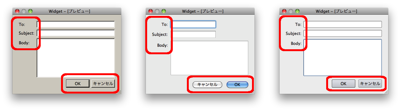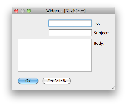 ラベルの文字を「To:」、「Subject:」、「Body:」のように変更すると Mac では Mac のスタイルガイドに合わせて右寄せの表示になります。また、ボタンの配置も Mac では「キャンセル」、「OK」の順番で並んでいますが、これもプラットフォームやプラットフォーム上のスタイルに応じて自動的に表示の順番が変わります。