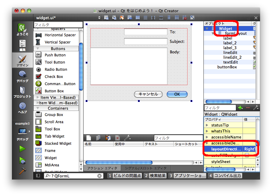 Widget の [qt "layoutDirection" l=qwidget m=#layoutDirection-prop] プロパティを「[qt "RightToLeft" l=qt m=#LayoutDirection-enum]」に変更してプレビューを表示してみてください。ラベルと入力ウィジェットの左右が入れ替わり、ボタンも左寄せになります。