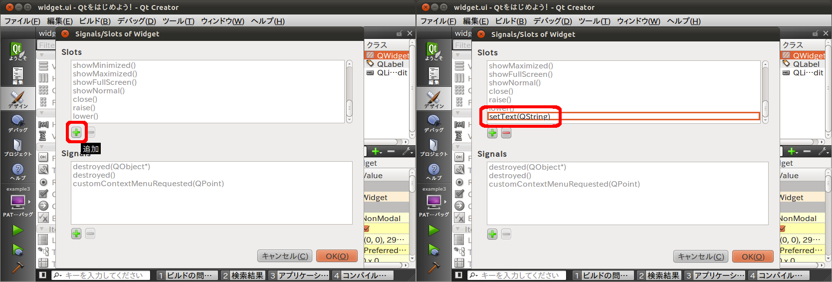 次に、Slots の下にある「+」ボタンを押し、Slots の一覧に「setText(QString)」を追加しましょう。