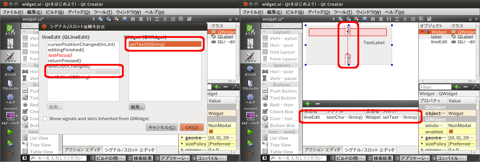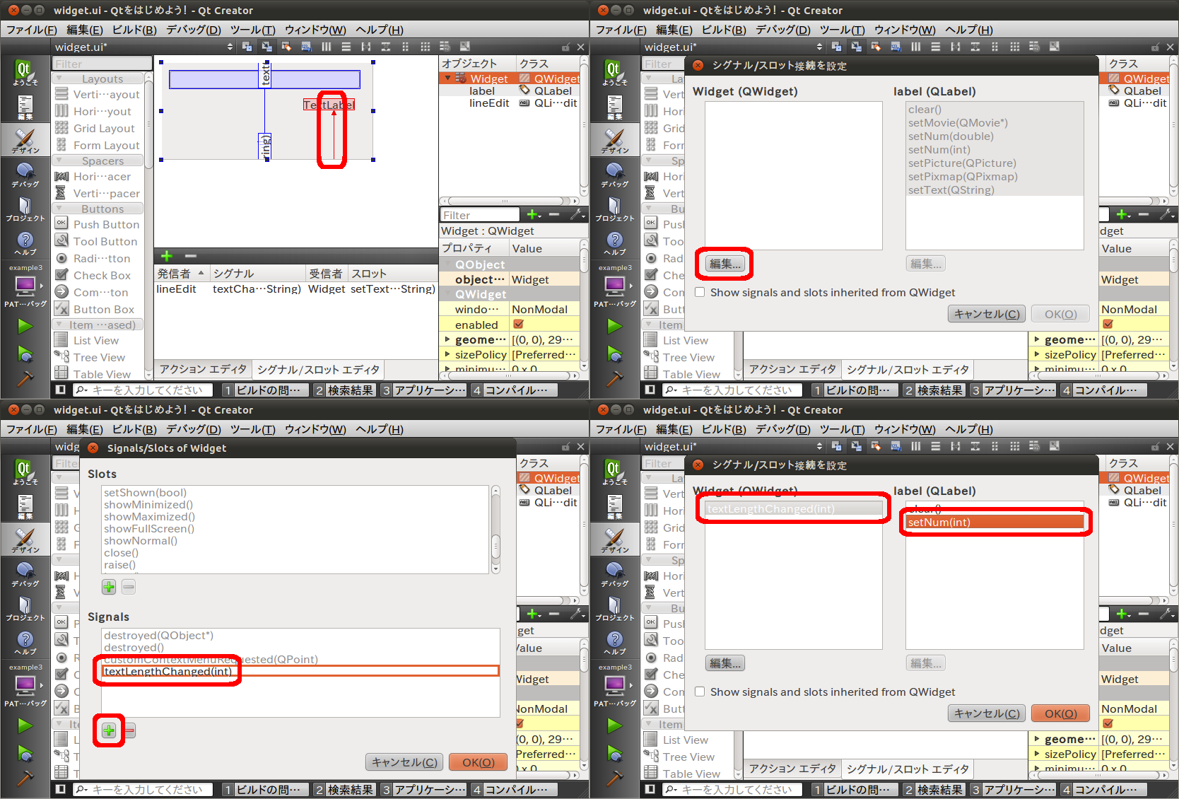 同じ要領で、Widget に作成した「textLengthChanged(int)」シグナルを Label の setNum(int) スロットに接続してみましょう。