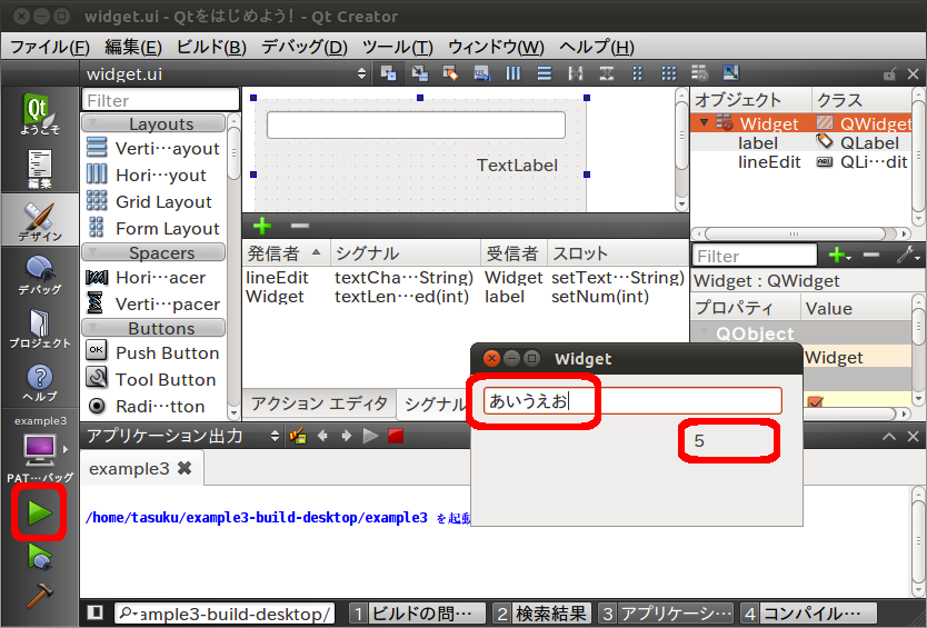 LineEdit に文字を入力し、配置したラベルに文字数が表示されている事を確認してください。