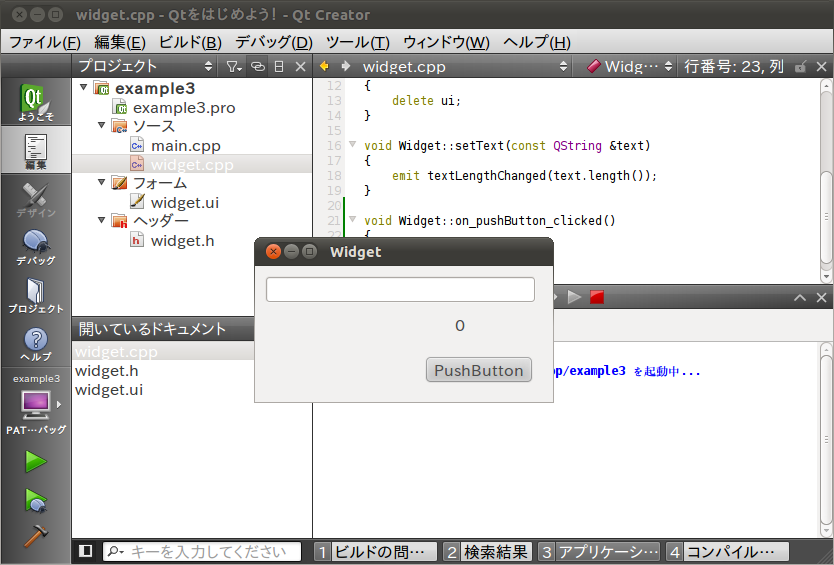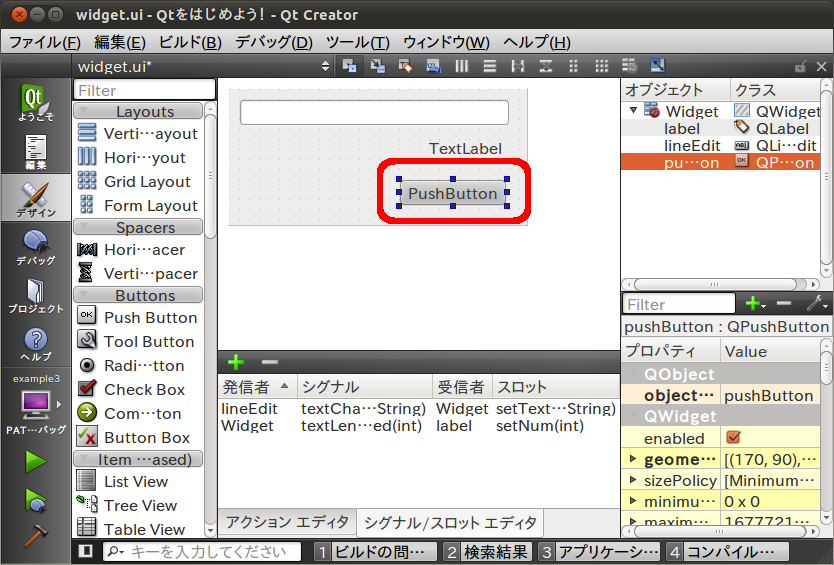 アプリケーションを実行し、LineEdit に適当な文字を入力した後、PushButton をクリックし、LineEdit の内容がクリアされることを確認してみてください。