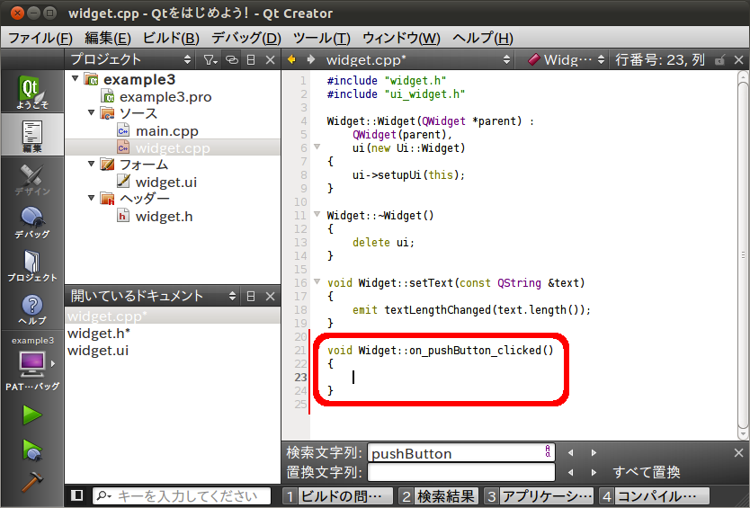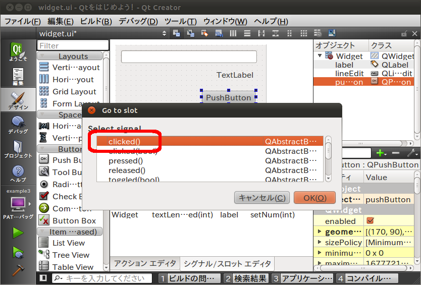 ここでは clicked() シグナルを選択します。「OK」ボタンをクリックすると以下のように widget.cpp に画面が切り替わります。