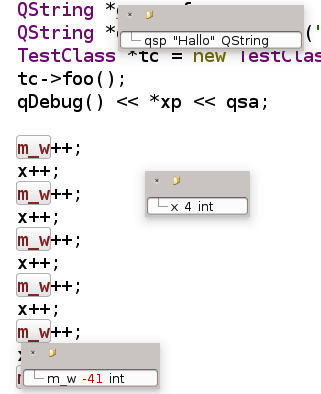 デバッグに関しては全体的に改良と修正を行いました。CDB エンジンには手が加えられ、特に同じプロジェクトを連続してデバッグする場合の起動時間の改善や、Qt Creator 自身のバイナリのビット数に関係なく32ビットや64ビットアプリケーションをデバッグ出来るようにするために作り直されました。デバッグツールにツールチップはピンを刺して固定できるようになりました。Symbian デバイスでのデバッグには新たに CODA デバッグエージェント("General OS related error" がありません :) )をサポートしました。CODA を利用する方法は ドキュメント を確認してください。また、 QML と C++ を同時にデバッグできるのも大きなアップデートです。