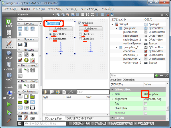 次にアクセスキーを設定してみましょう。各ウィジェットをダブルクリックし、表示している文字を編集します。以下のように該当する箇所に "&" を挿入してください。