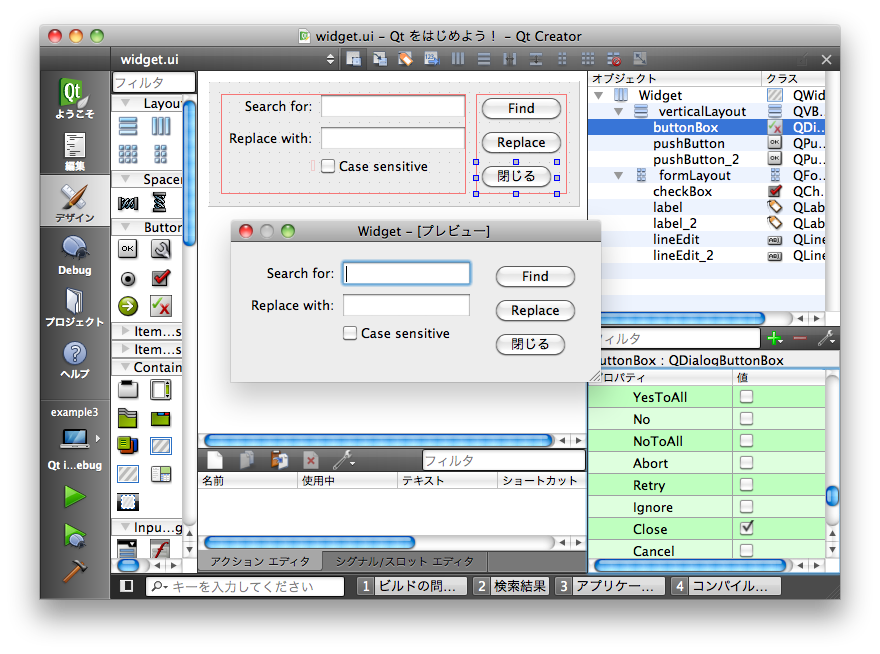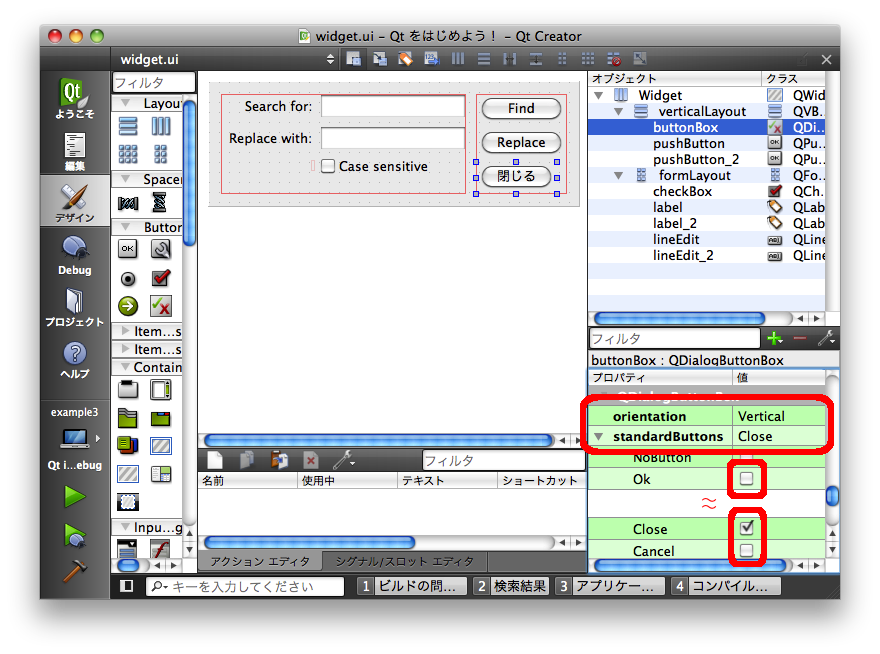 - standardButtons プロパティのチェックで "OK" と "Cancel" を無効にし、"Close" を有効に変更