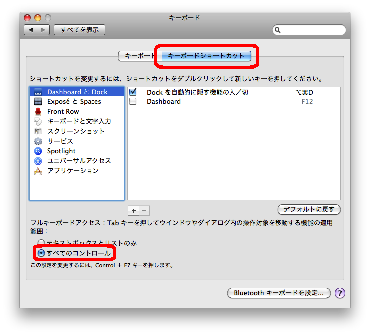 Mac の場合にはデフォルトでは上記のうち LineEdit のみがフォーカスの対象になります。タブキーを押した際に PushButton や CheckButton にもフォーカスが移るようにする場合は Mac の「システム環境設定」→「キーボード」を開き、「キーボードショットカット」タブの「フルキーボードアクセス」の設定を "すべてのコントロール" に変更してください。