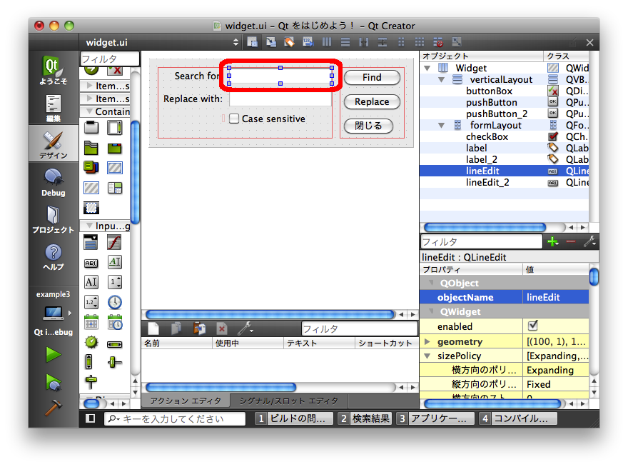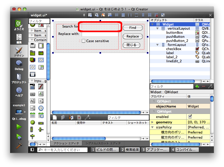 はじめに、上記で作成したフォームから "Search For" 用の LineEdit を削除します。この LineEdit を選択し「Del」キーか「Backspace」キー、もしくはそれに相当するキーを押してください。ウィジェットの削除はメニューの「編集」→「削除」やコンテキストメニューの「削除」でも可能です。