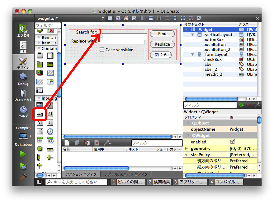 次に、左側のウィジェットペインから "Search for" の LineEdit があった場所に再度 LineEdit をドラッグ&ドロップで追加します。この際、レイアウトの解除は行わずに、このレイアウト(FormLayout)の "Search for:" のラベルの右側のスペースにドロップしてください。
