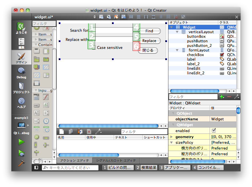 "Search for:" と "Replace with:" では 前回 学んだ Buddy の設定もそれぞれの右側にある LineEdit に対して行っています。
